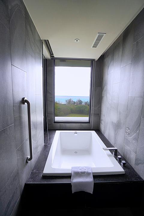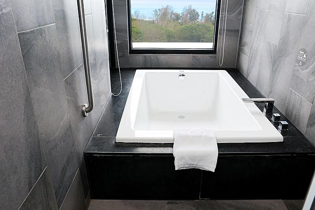 窓付きバスルームの中央に洗面台が。その左右にトイレ(ウォシュレット)と浴室を設置した完全分離になっています。バスタブ(全室あり)の手前にはシャワーがあって洗い場と分けられているのが高ポイント!オーシャンビュールームなら海を見ながら入浴もOKな理想的なお風呂です。