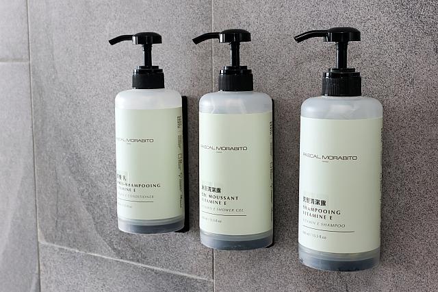 アメニティ(シャンプー・コンディショナー・ボディソープはフランスの老舗メゾンPASCAL MORABITOのもの(ボディソープは中央)