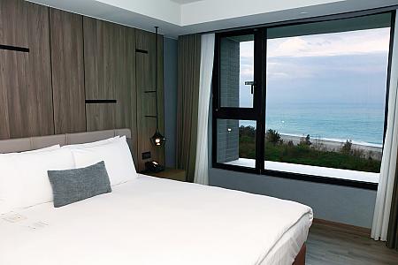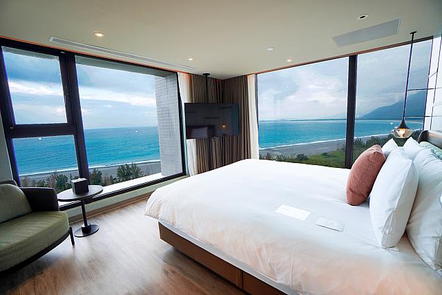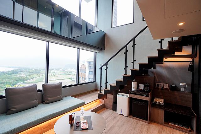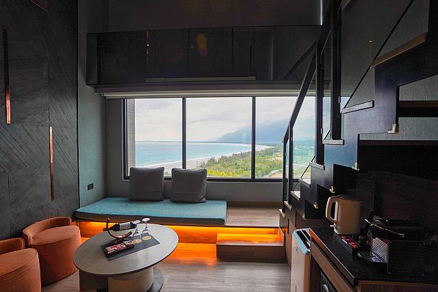 メゾネットタイプのコーナースイートルームです。ダブルベッドを備えたベッドルームは、上階フロアと下階フロアに1部屋ずつあり、どちらも2面の窓から花蓮の観光名所・月牙湾の美しい海岸線を見渡せます。