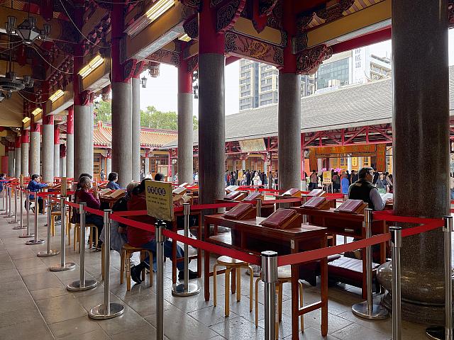 入口は向かって右側の門から入ります。中に入るとすぐ、青い法衣を着た「効労生」と呼ばれるボランティアの方々が目に入ります。みなさん静かに、真剣な表情で『列聖寶經合冊』を読まれていました。
